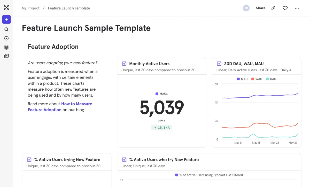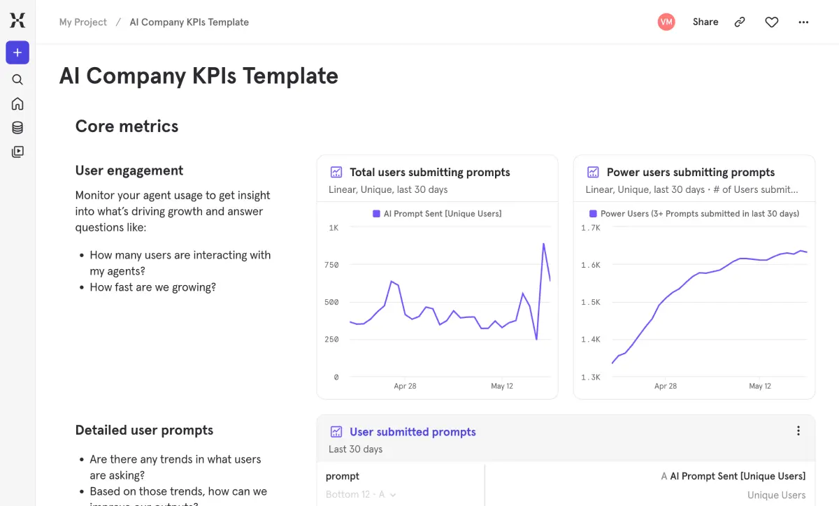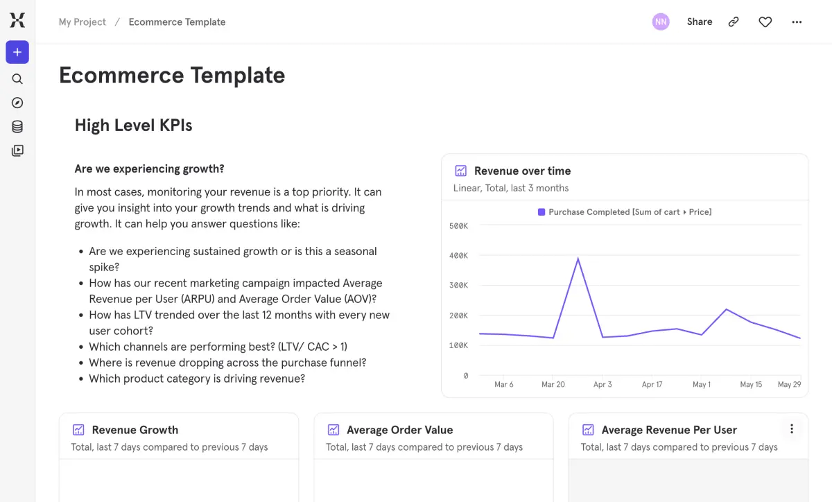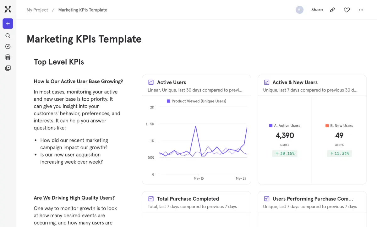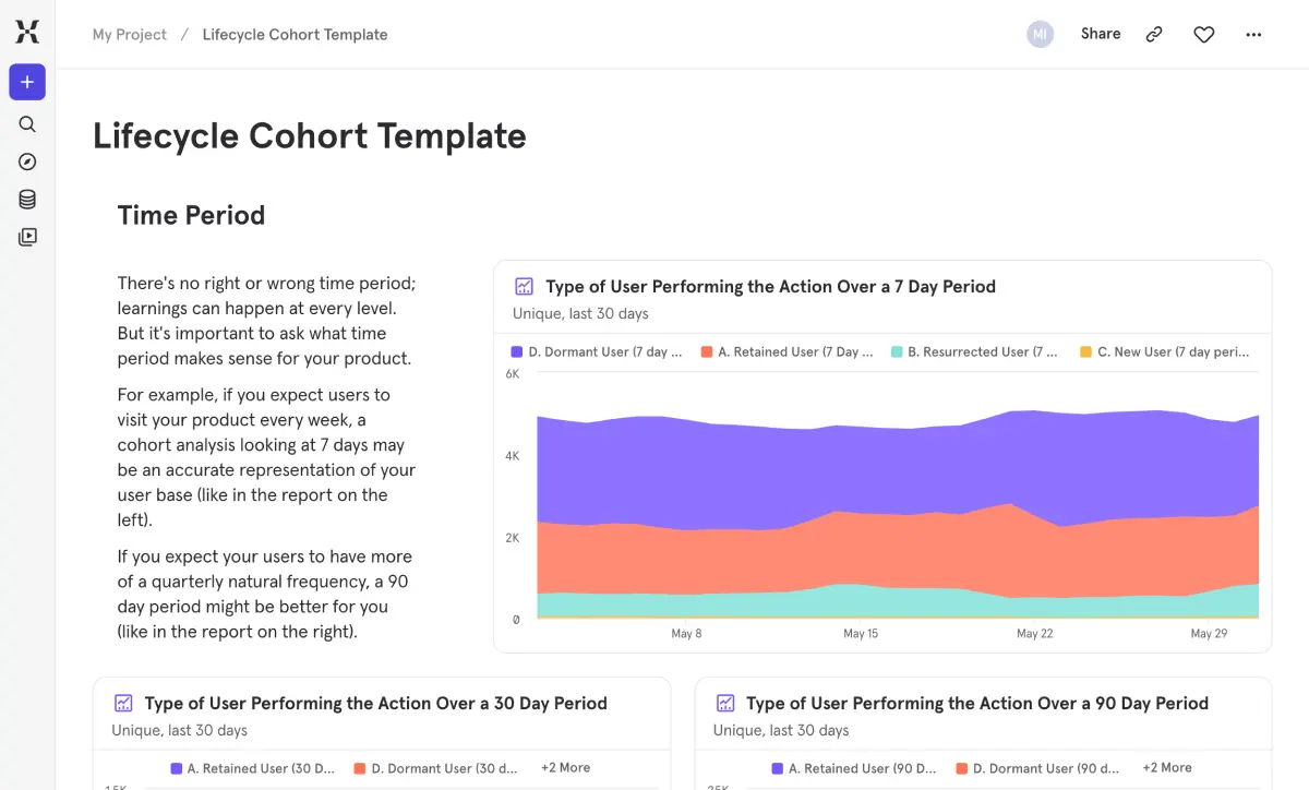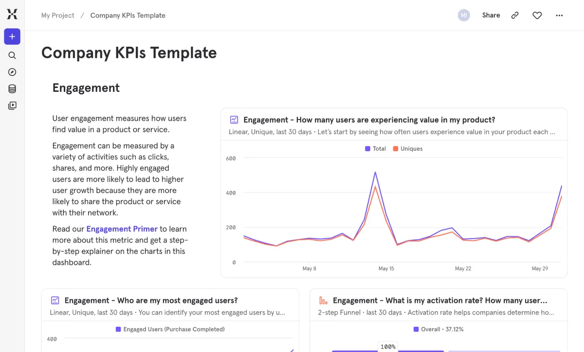 Pick a template above to explore the interactive demo. Once you’re ready to use it with your own data, simply click “Create a Board” button to activate the Template Selector in Mixpanel. Your reports will populate automatically, and you can customize any metric, filter, or visualization from there.